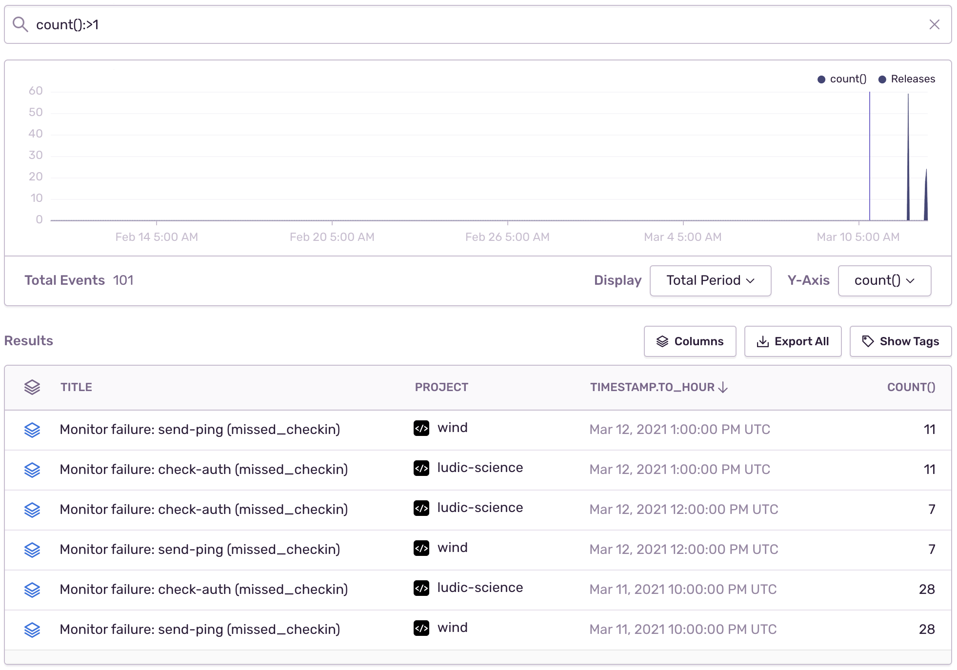 4. Edit the "Results" table columns to show the number of events [count()], impacted users [count_unique(user)], and unique issues [count_unique(issue)] per project.